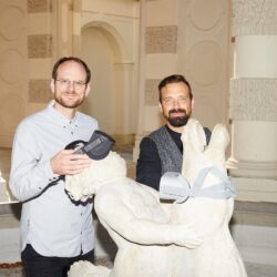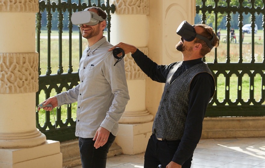 Das nachmittägliche Septemberlicht flutet den Eichstätter Hofgarten, als Florian Sochatzy und Johannes Grapentin ihn durchqueren. Auf ihrem Weg grüßen sie mehrere Bekannte, ein paar Meter weiter spielt Sochatzys Tochter auf einem Kindergeburtstag. Eichstätt hat 13.000 Einwohner:innen, da trifft man öfter jemanden, den man kennt. Und die Geschäftsführer des Instituts für digitales Lernen fallen auf – vor allem, wenn sie wie jetzt fürs Fotoshooting, VR-Brillen unterm Arm tragen.